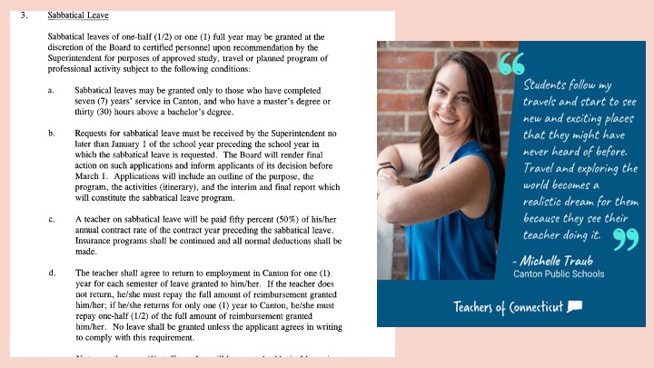 Michelle Traub, a former teacher from Canton, shared her journey of listening to the universe and pursuing her dream of long-term travel despite health challenges. After being diagnosed with chronic Lyme disease at 17, which severely impacted her physical abilities, Michelle maintained her passion for travel, eventually taking a sabbatical from teaching to fulfill her dream. When her initial sabbatical request was denied, she found an unexpected opportunity to teach in West Hartford from September to January, allowing her to afford her 8-month travel plans.